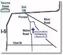 Directions to Our Church From Interstate 5: Take exit 135 ("Hwy 167, Bay Street"). Go east on River Road (Hwy 167) past the casino. Bear right at the stoplight onto Pioneer Road. Go a mile to Waller Road, turn right. Go about a mile south on Waller Road and you will see Ascension Lutheran Church on your left. Ascension Lutheran Church is at: 4501 Waller Road E. Tacoma Washington, 98443 |